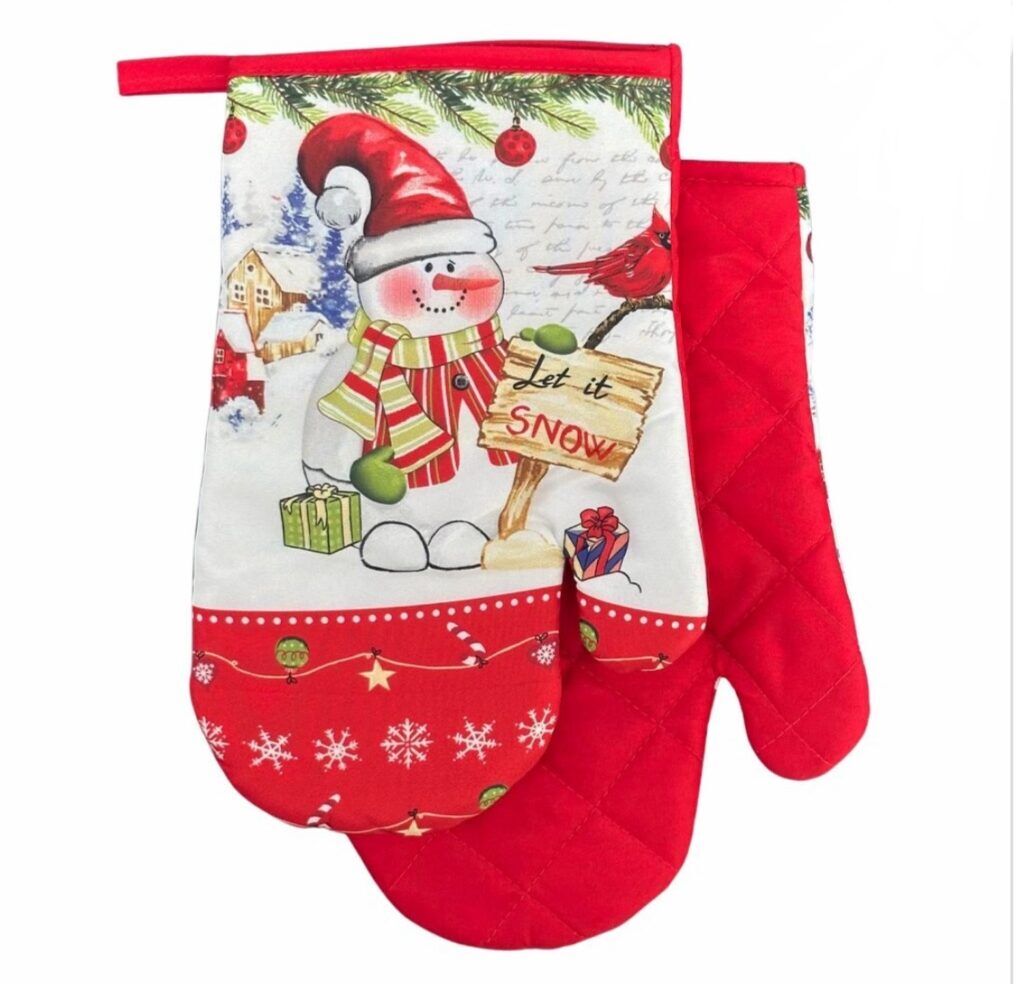 Kuchynská rukavica štandardného tvaru s magnetom. Povrch rukavice je 100% bavlna a výplň vatelín. Krásny vianočný motív, ktorý skrášli každú kuchyňu.
