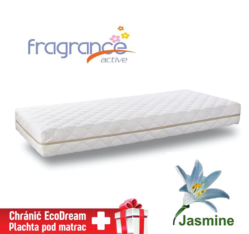 Jasmín je jeden z najvýznamnejších olejov na nervové ukľudnenie a proti depresii, uvoľňuje strach, napätie, nekľud a úzkosť, povznáša ducha, harmonizuje menštruáciu, ako tonikum maternice pomáha pri pôrode, podporuje sexuálnu túžbu. Elastická snímateľná poťahová látka JASMINE s krémovo-zeleno-fialovým logom s mikrokapsulami, ktoré uvoľňujú prírodné esencie a oleje a posilňujú harmóniu a pohodu tela, mysle a ducha.